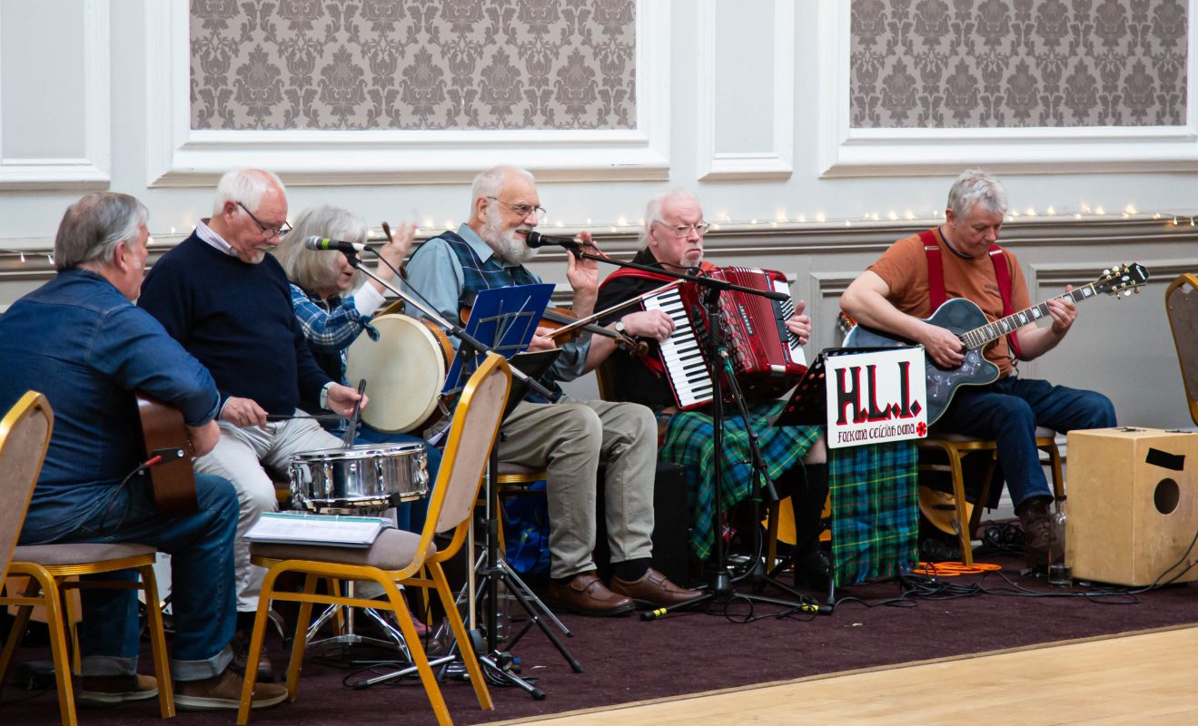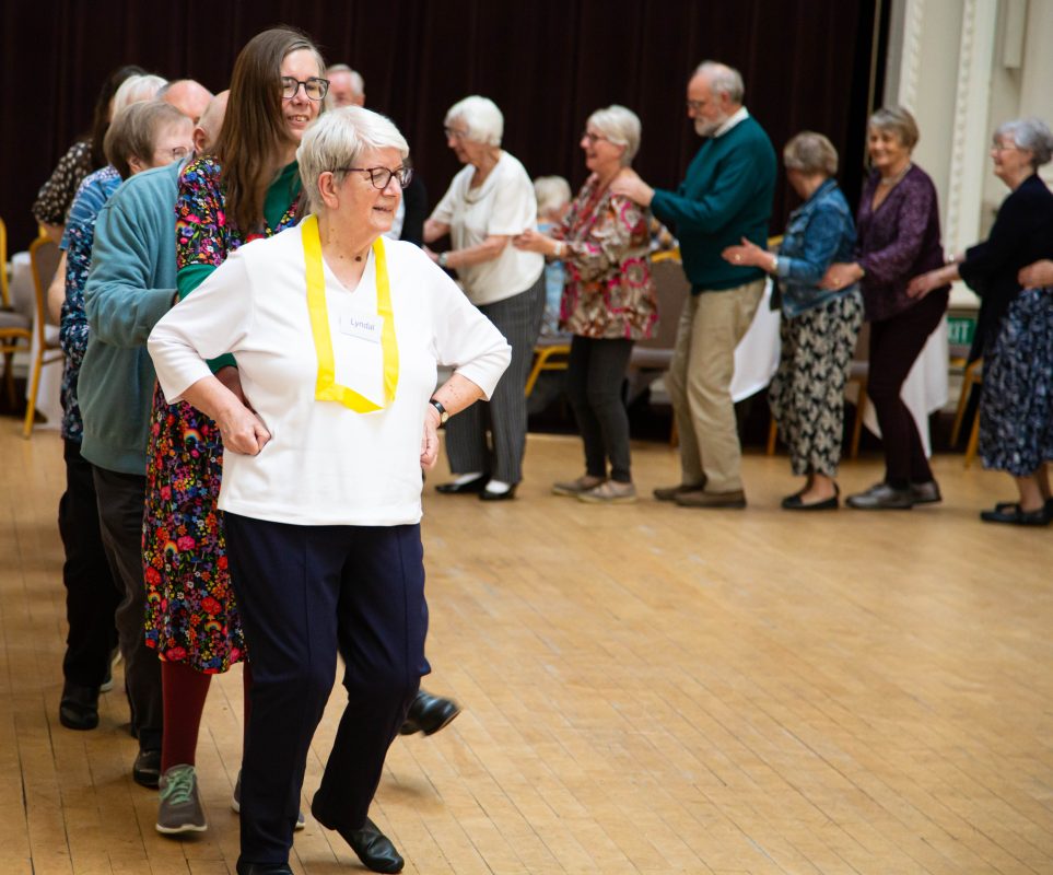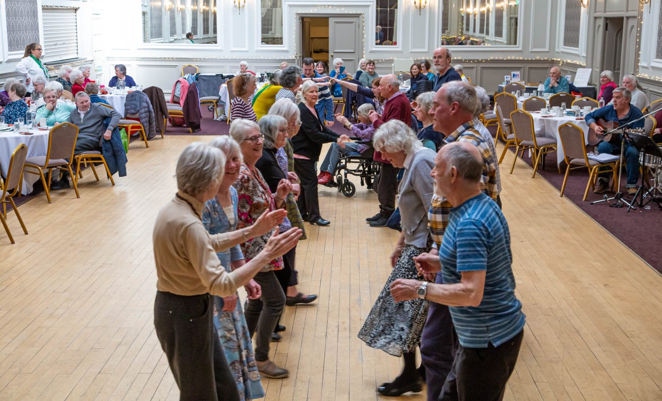 So MacFarlane Hall was chosen for the rest of the Peebles dances. We enjoyed the benefit of a generous grant from SBC Happier Healthier Stronger Fund which stipulated that we had to take the dances out to rural Tweeddale as well. Innerleithen Parish Church, Newlands Centre and Broughton Village Hall, were all wonderful spaces to hold a dance in. Borders Wheels provided transport. We hoped to spread the word about dementia awareness in the communities and get rid of any stigma that might still linger in any minds to prove that people living with dementia can still participate in normal activities with their friends and families and have a great time. People came in Wheelchairs and with Walkers and danced in and around them as part of a set whilst the band played on. Whole families from babes in arms to grandparents in their nineties joined in the fun. The whole experience was gloriously exciting and memorable throughout 2024.