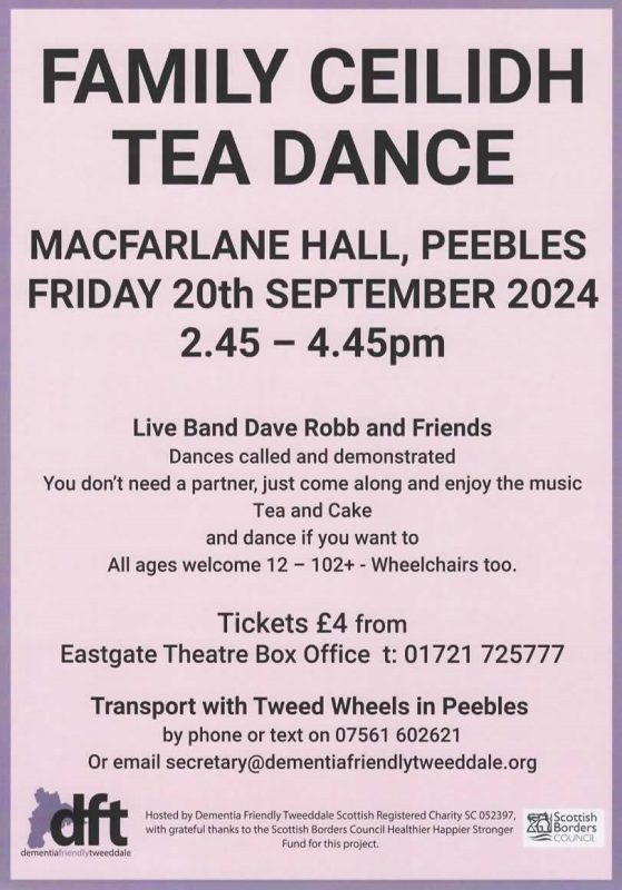 Please support the Tea Dances again this year. If we get more volunteers we can put them on every month – see our Facebook page Dementia Friendly Tweeddale for announcements about this and everything else that happens in our busy calendar.